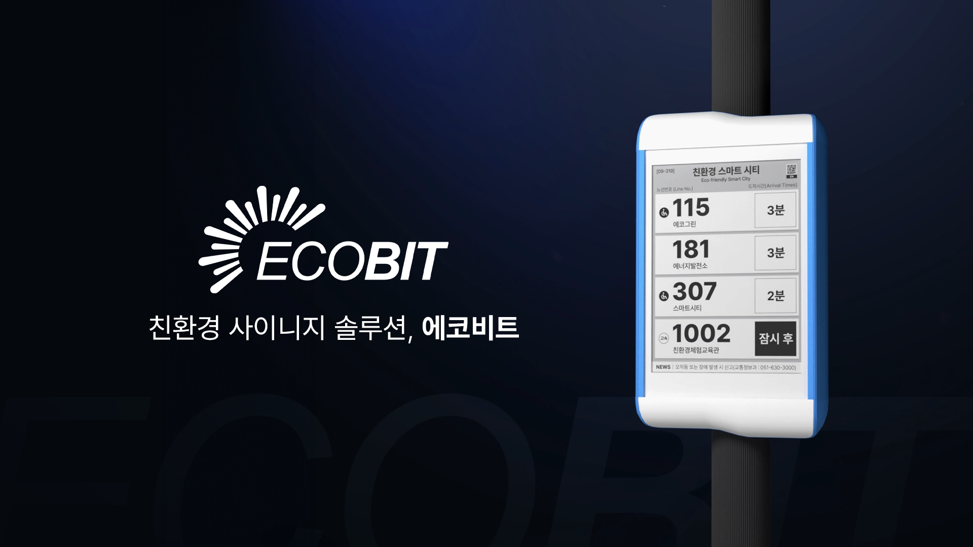 ECOBIT는 100%태양광 에너지와 저전력 전자종이를 사용하여 교통, 안전, 생활, 문화 등 다양한 정보를 누구나 쉽게 확인할 수 있습니다.
